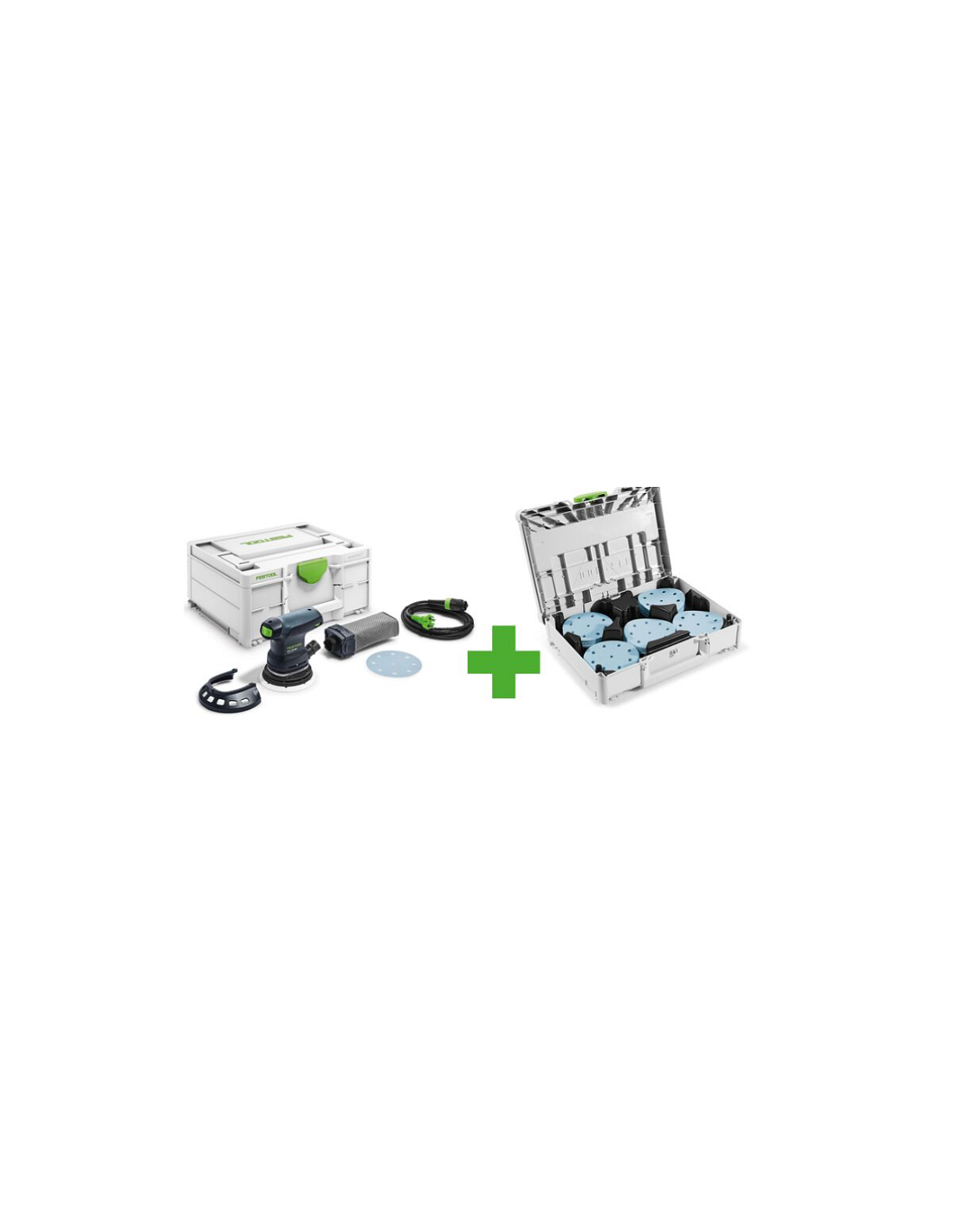 Rozsah dodávky: brusný talíř StickFix Ø 125 mm (měkký-HT), chránič Festool PROTECTOR, vak na prach Longlife, síťový kabel plug it (4 m),