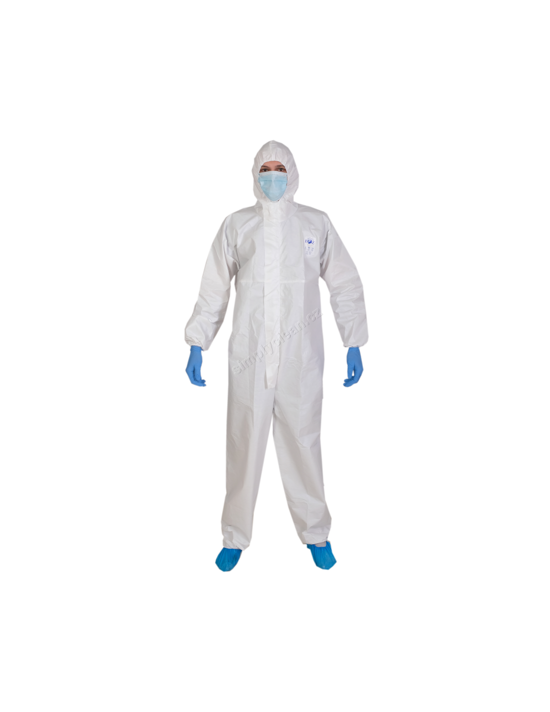 Jednorázový ochranný overal, bílý, vhodný na ochranu celého těla proti chemikáliím.